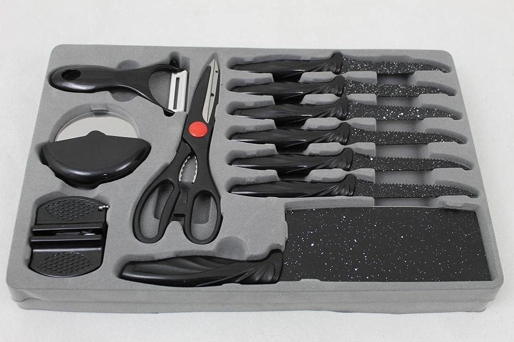 مجموعة سكاكين المطبخ المطلية بالجرانيت المكونة من 18 قطعة هي الإضافة المثالية لأي مجموعة من عشاق الطهي. تتميز كل سكين بطلاء جرانيت ممتاز، وتوفر سطحًا غير لاصق لقطع سلس وبدون مجهود، بينما تضمن الشفرات المصنوعة من الستانلس ستيل عالي الكربون حدة ومتانة تدوم طويلاً.